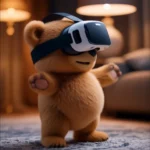 A little bear is wearing an HMD and having fun playing a VR game in his room