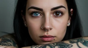 A young woman with vibrant, colorful tattoos covering her arms and shoulders, deeply engaged in conversation, smiling warmly. Close-up shot, focusing on her expressive face and intricate tattoos. Detailed, realistic style, soft lighting.