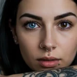 A young woman with vibrant, colorful tattoos covering her arms and shoulders, deeply engaged in conversation, smiling warmly. Close-up shot, focusing on her expressive face and intricate tattoos. Detailed, realistic style, soft lighting.